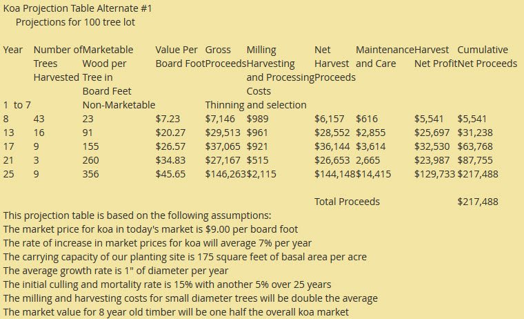 This is the “for profit” subsidiary and I have kept this for last because I wanted to first show the amount of energy this company is putting into planting the trees. This is certainly not your average run of the mill sustainable wood company. They are on a mission to bring back Koa tree forests! Obviously, bringing back a whole forest of Koa trees requires funding and so this subsidiary is focused on providing just that. Essentially, it sells Koa trees as an investment opportunity in lots of 100 trees for around $11k. Their web page shows three projection tables with the least optimistic one (see chart below) showing a return of $217k within 25 years. That’s a fairly substantial return in my book!